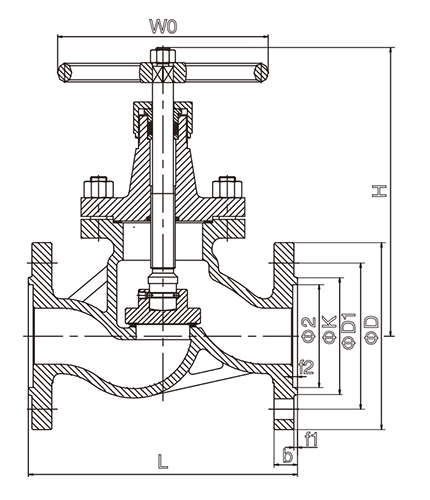 | DN(mm) | L | D | D1 | K | D2 | b | f1 | f2 | Z-d | H | W0 | ||